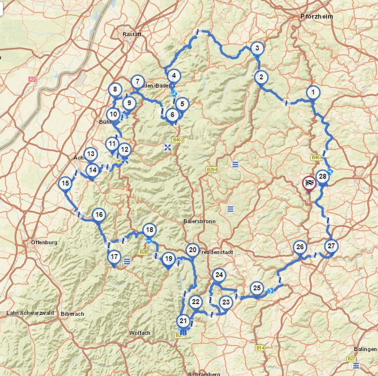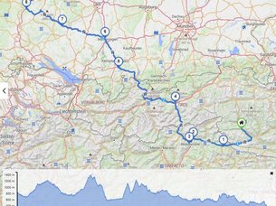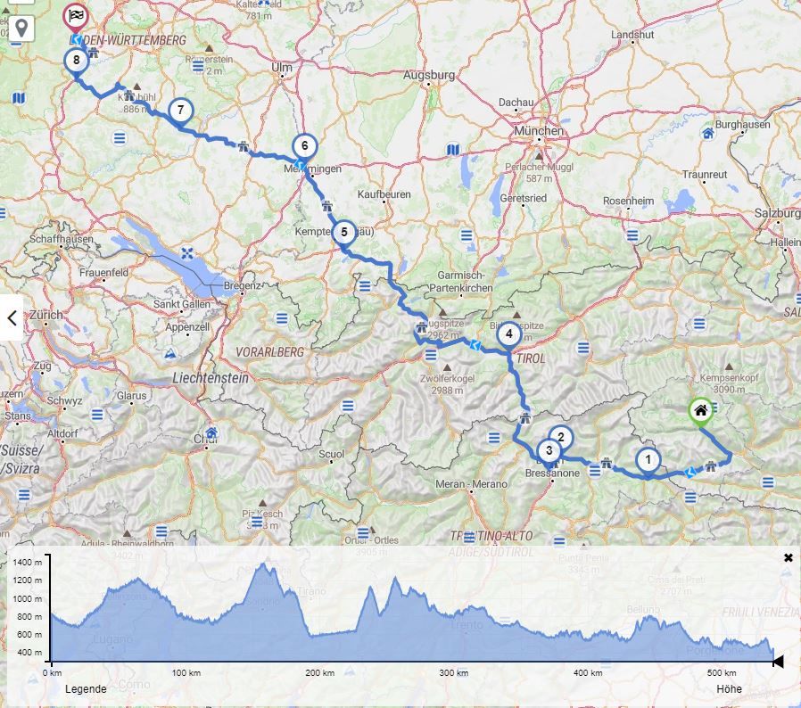 Verlauf:Martei / Lienz / Pustertaler Straße / Brenner / Fernpass / Memmingen / Riedlingen / Nagold