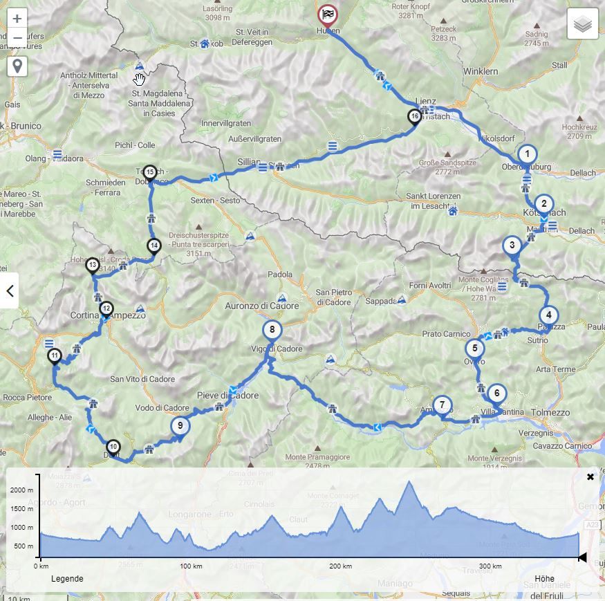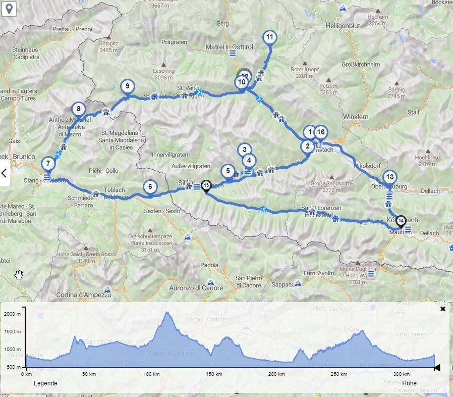 Verlauf:Pustertaler Höhenstraße / Staller Sattel / Antholzer Tal / Defereggental / Kalser Glocknerstraße / Gailbergsattel / Lesachtal / Untertilliach / Kartitscher Sattel