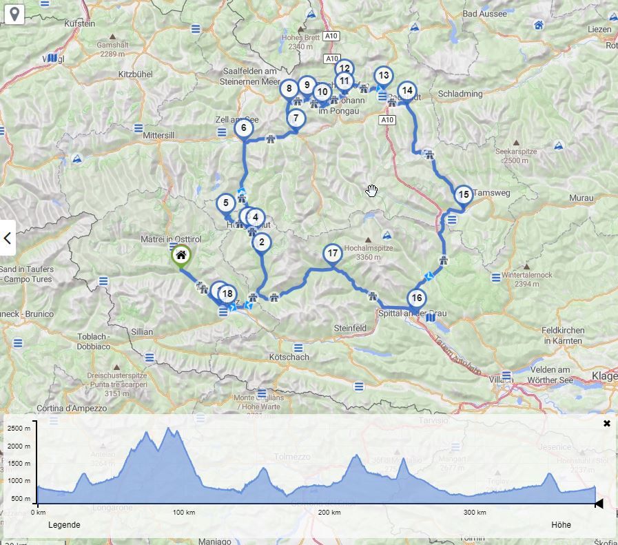 Verlauf:Großglockner Hochalpenstraße / Taxenbach / Dienter Sattel / Tauernpass / Gurktaler Alpen / Gmünd / Mölltal