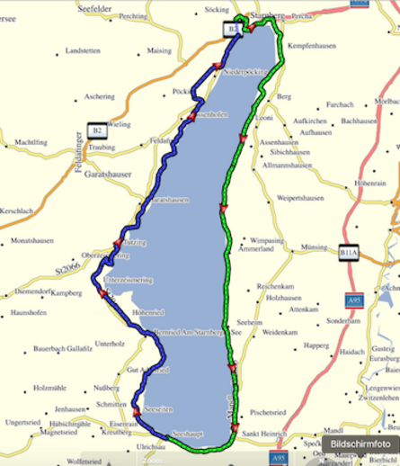 Eigentlich wollten wir nur die erste Hälfte des Starnberger Sees mit dem Fahhrad (grüne Linie) befahren und mit dem Schiff wieder zurück zum Startpunkt. Aber "Corona" gönnte uns nicht dieses Vergnügen und mussten so zwangsläufig die zweite Hälfte auch noch fahren (blaue Linie). Es war eine wunderschöne Seeumrundung mit vielen schönen Aussichtspunkten. Letztendlich waren es dann ca. 55 km, die wir an dem Tag zurücklegten.
