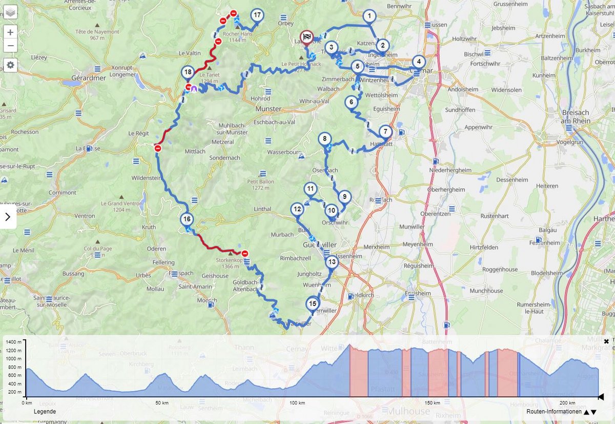 | Verlauf: | Labaroche / Col de Fréland / Col Haut de Ribeauvillé / Col du Bonhomme / Col de Mandray / Col des Chaufours / Col d'Hermanpaire / Col du Hantz / Col de Saâles / Col d'Urbeis / Bergheim / Labaroche |